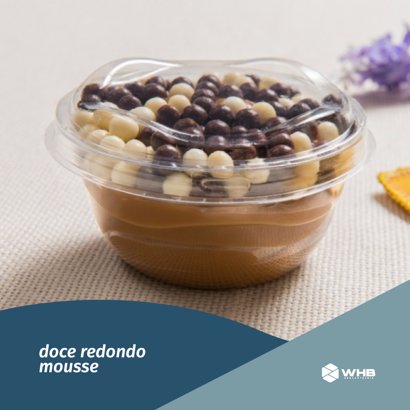 A versão da embalagem para mousse com tampa baixa. A capacidade total dela é de 70ml e possui um design moderno. Sua tampa auxilia no transporte dos produtos com segurança. Ideal para sobremesas, pavês, mousses e outros doces pequenos.